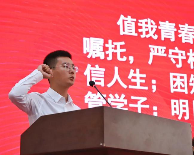 2021级辅导员孙唯一老师带领全体新同学庄严宣誓:值我青春年华,融入美好农大;牢记父母嘱托,严守校规校纪;铭记青春使命,追求自信人生;困知勉行,积厚成器;今日,我是经管学子;明日,我是祖国栋梁。