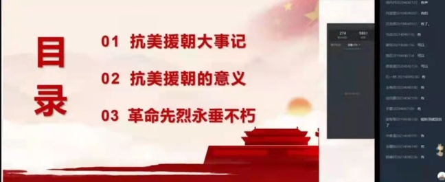 活动开始,学生第九党支部党员龚文莉作为主讲人,为大家详细讲解了志愿军战士保家卫国的过程和革命先烈事迹,并为同学们播放了纪录片《全景回顾抗美援朝历史》。同学们纷纷表示,通过回望历史,体会到建国初期要立足的决心,我们会坚定理想信念,继续延续优良传统,不忘初心,砥砺前行。