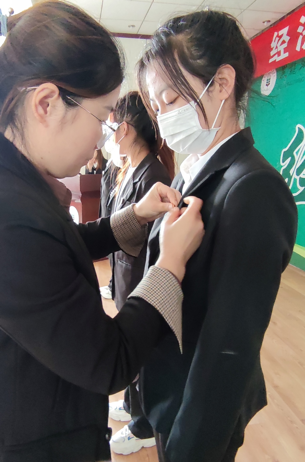 伴随着团旗的入场,入团仪式正式开始,学院党委副书记闯垒和2019级辅导员梁净为6名新团员佩戴团徽。