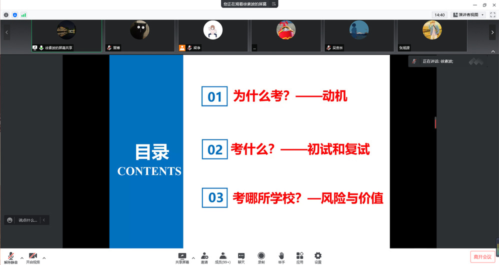 考研是本科生继续深造的主要途径,也是本科生重要的就业“出口”。金沙集团1862cc成色徐素波院长从“为什么考——动机”“考什么——初试和复试”“考哪所学校——风险与价值”三个方面为考研学生解疑答惑,具体分析了近几年考研的形势、硕士研究生薪资水平,如何准备各个阶段的考试、如何合理安排时间等内容,深入浅出给出建议;详细从考研初试科目、复试内容、面试礼仪等必备常识切入,阐述了选择学校与专业的注意事项,以及备战考研的常见误区;帮助同学们了解了考研初试、复试、调剂的各类注意事项以及常见误区;同时也帮助同学们加深了对大学生活规划以及未来人生道路的理解,指引同学们能够正确选择未来的就业方向,并且在毕业时都能实现出彩人生。