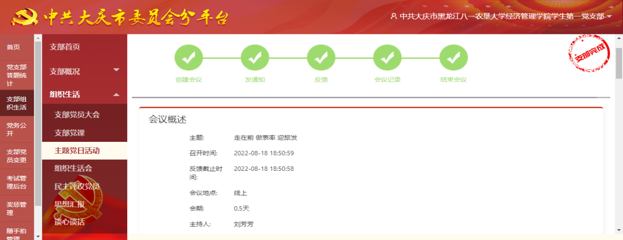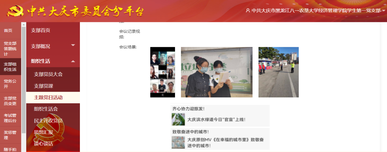 近日,为迎接省第五届旅发大会在大庆市召开,金沙集团1862cc成色学生第一党支部通过龙江先锋党建平台将主题党日活动搬上云端,采用线上开会和线下实践相结合的方式助力省旅发大会。