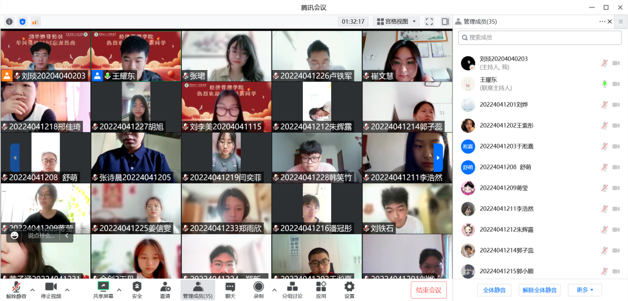 学校党委书记董广芝、校长郑喜群、党委副书记高宏、学生处处长金耀武及相关工作人员来到腾讯会议室详细了解和询问新生报到情况,检查并指导线上迎新工作,与同学们亲切交流。