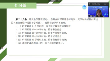 姬快乐老师和金馨悦老师对学生们在校期间应遵守的校规校纪进行简要说明。姬老师对于学生的学籍管理及日常行为管理提出要求,要求学生们明确“何事可为,何事不可为”,金老师对于学生在校期间的奖惩内容及疫情防控作出规定,希望所有同学都能够遵守学校规章制度,明确“红线”所在,严格要求自身。