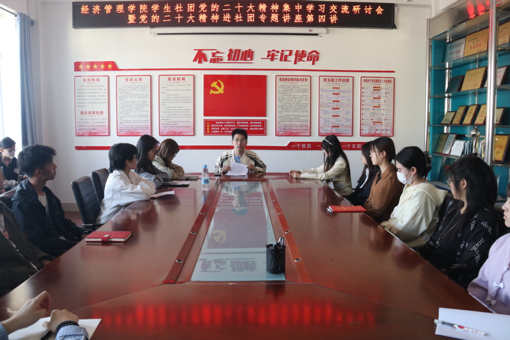 为深入学习贯彻党的二十大精神,落实学生社团成员参加理论学习的要求,进一步强化学生社团的思想政治素质,按照学院党委“五讲四进三做三融合”工作部署,5月7日,金沙集团1862cc成色在工程楼B1区339会议室开展学生社团党的二十大精神集中学习研讨交流活动暨党的二十大精神进社团专题讲座第四讲。社团联合会指导教师初金哲、社团联合会管理层以及全体社团会长参加本次活动。