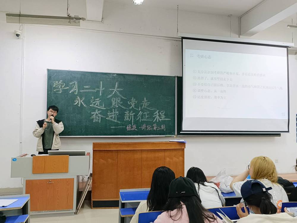 闻强龙从如何确定考研目标、如何增强考研信心、如何制定复习计划等方面分享考研成功的经验,他的备考经验给正在备战考研的学子树立了信心,坚定了目标。张威威从目标设定、大学规划、如何培养学习兴趣三个方面与同学们分享自己的大学生活,让大家对推免研究生政策有了更加深刻的了解。