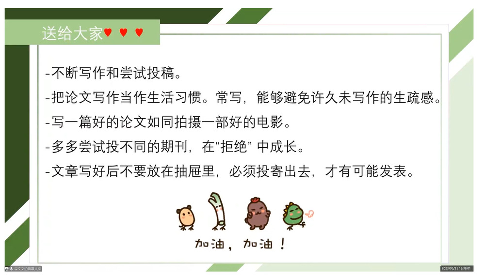 李文文详细讲解了论文的结构和写作顺序,分享了自己在科研过程中自我调节与提升的方法,即使论文退稿也不要气馁,要像拍电影一样写论文,要永葆高昂的学术激情。