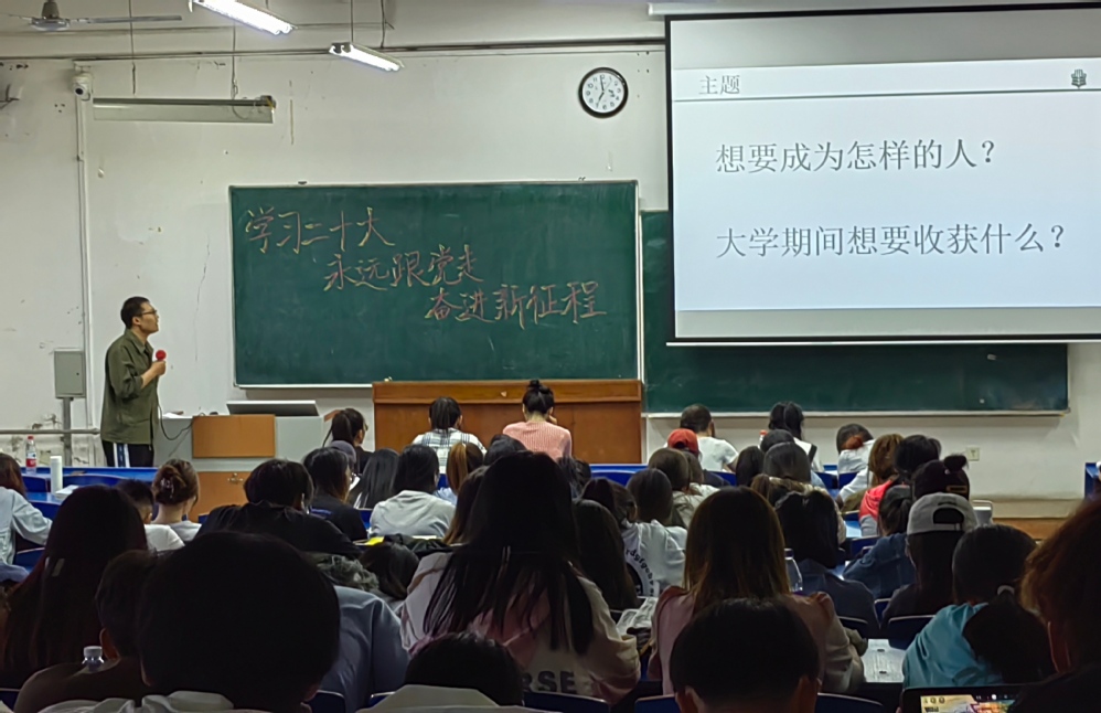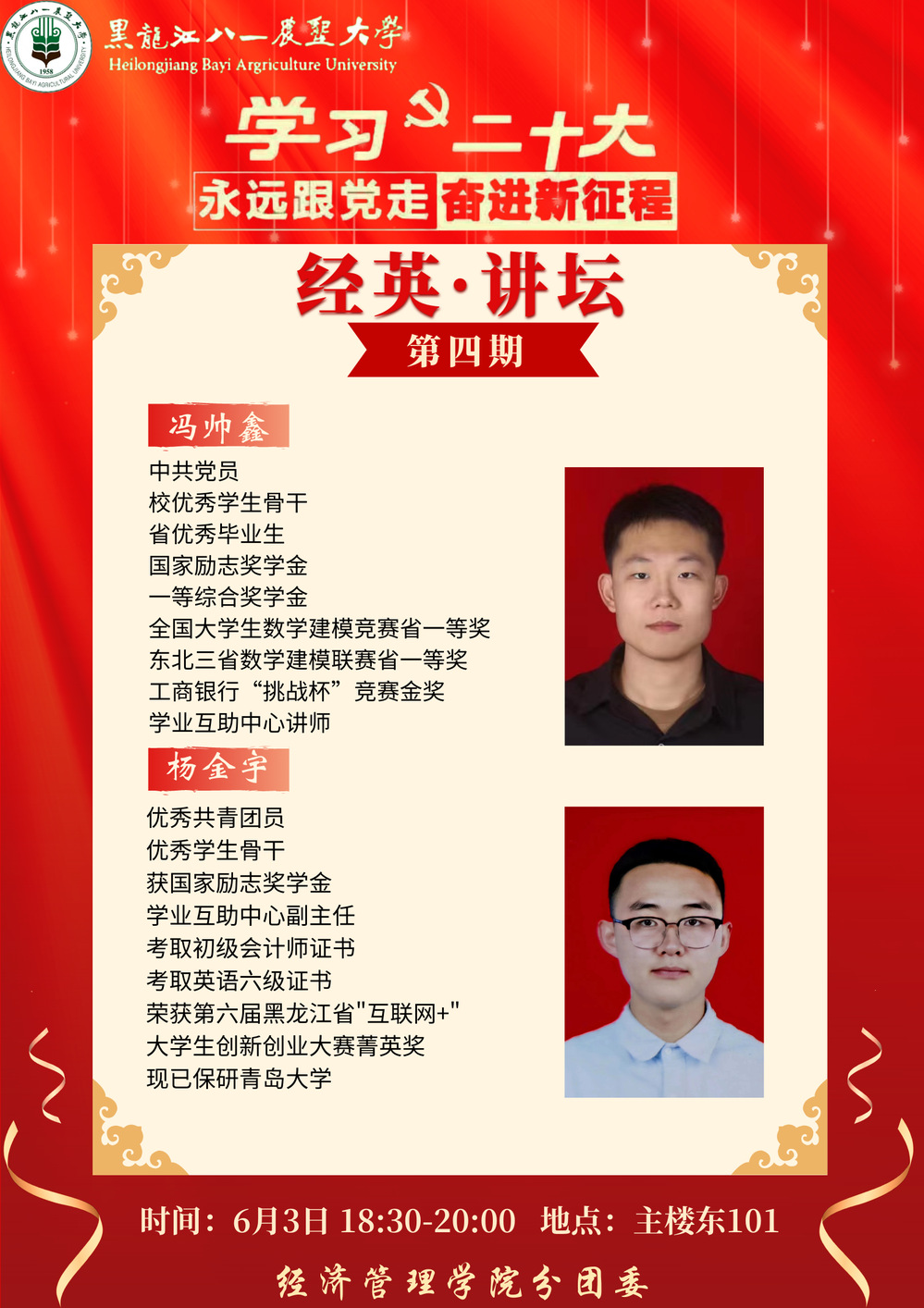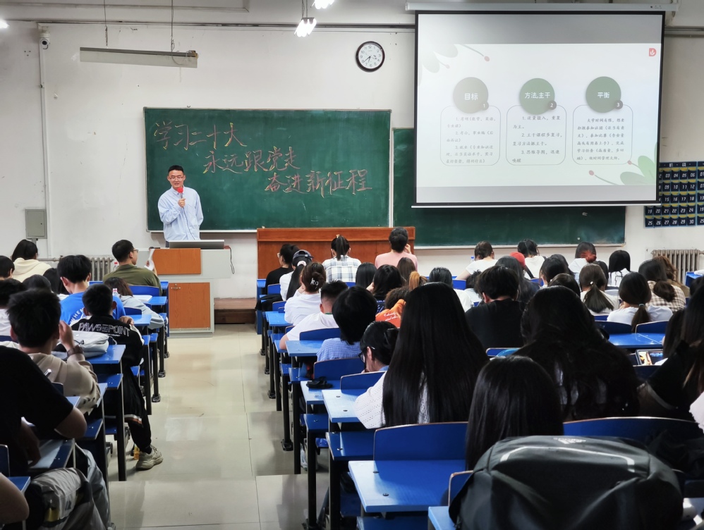 为充分发挥优秀学生典型的示范引领作用,6月3日,金沙集团1862cc成色在主楼东101室举办以“学习二十大,永远跟党走,奋进新征程”为主题的第四期“经英”讲坛活动。本次活动特邀2019级就业先锋冯帅鑫和推免研究生杨金宇两位同学进行分享,活动共计140余人参加。