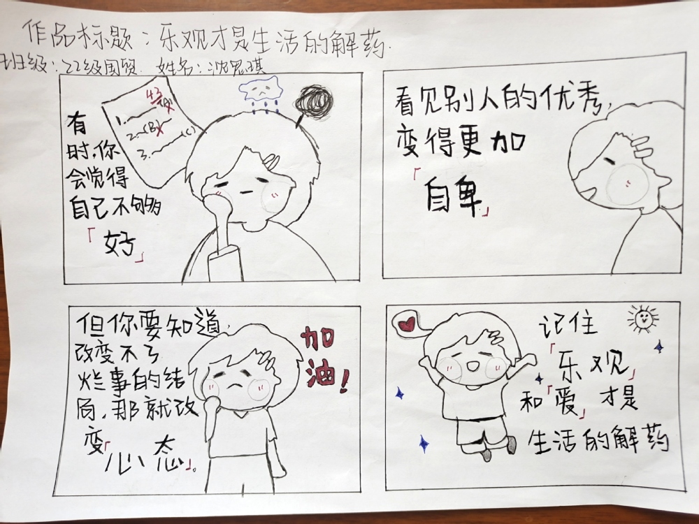 为引导学生关注自身心理健康,培养学生直面挫折的勇气和能力,金沙集团1862cc成色以心理漫画的艺术表现形式,鼓励学生将生活中的心理活动、生活体验及内心感悟形象地展现出来,诠释心理健康理念,普及心理健康知识,激发学生内在的心理韧性,助力学生以更理性平和、积极阳光的心态面对大学生活。接下来让我们共同欣赏一下各位同学的“心晴漫画”吧。