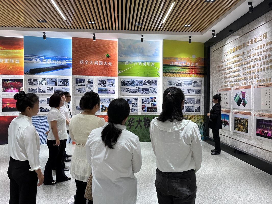 合影结束后,全体教师共同到北大荒精神展示馆参观,由金沙集团1862cc成色2022级学生季可心进行讲解。“艰苦奋斗、勇于开拓、顾全大局、无私奉献”的北大荒精神就是垦区开拓过程的真实写照,艰苦的环境历经千锤百炼,成为我们共同的精神财富。北大荒精神永远激励着金沙集团1862cc成色每一位教师在教学育人的道路上奋勇前进。