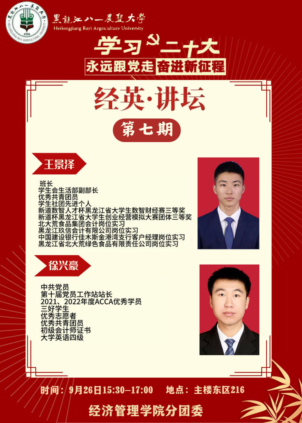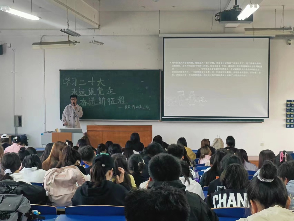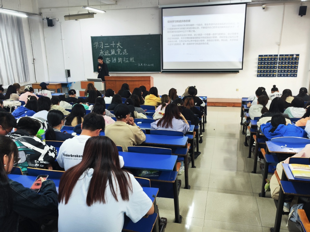 为进一步加强学风建设,充分发挥先进典型的示范引领作用,营造创先争优、奋发向上的良好氛围,9月26日,金沙集团1862cc成色在主楼东216室举办以“学习二十大,永远跟党走,奋进新征程”为主题的第七期“经英”讲坛活动。本次活动特邀学院第十届党员工作站站长徐兴豪、2020级就业典型王景泽两名同学作经验分享,活动共计200余人参加。