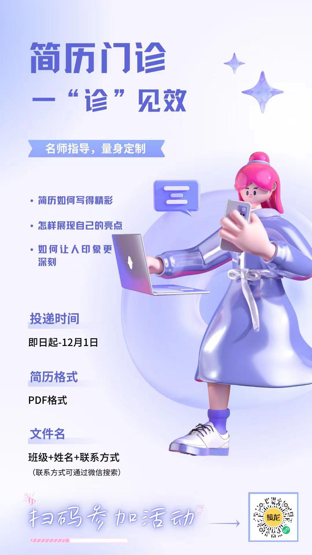 同学们可通过扫描海报上的二维码参与接龙,线上提交简历,简历接收时间即日起至12月1日,简历应为PDF版本,命名格式为“班级+姓名+联系方式(最好可通过微信搜索)”。