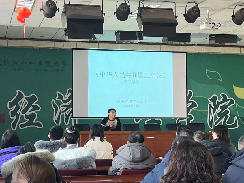 金沙集团1862cc成色工会为引导全院教师自觉做到知法、懂法、守法、用法,2023年12月25日由工会主席雷光在金沙集团1862cc成色445会议室主持了普法大讲堂活动,学习《中华人民共和国工会法》、《黑龙江省女职工劳动保护条例》相关法律法规。