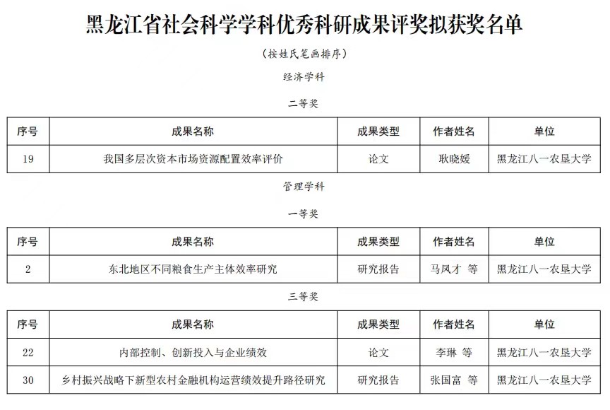 1月2日,黑龙江省社会科学界联合会公布了2023年度黑龙江省社会科学学科优秀科研成果评奖评审结果,我院共有4项成果获奖,其中马凤才老师荣获黑龙江省社会科学学科优秀科研成果(管理学科)一等奖、耿晓媛老师荣获黑龙江省社会科学学科优秀科研成果(经济学科)二等奖、李琳老师和张国富老师荣获黑龙江省社会科学学科优秀科研成果(管理学科)三等奖。此次获奖成果所属学科分别为管理学和经济学,充分彰显了我院在管理学和经济学研究领域的深厚实力和学科优势。