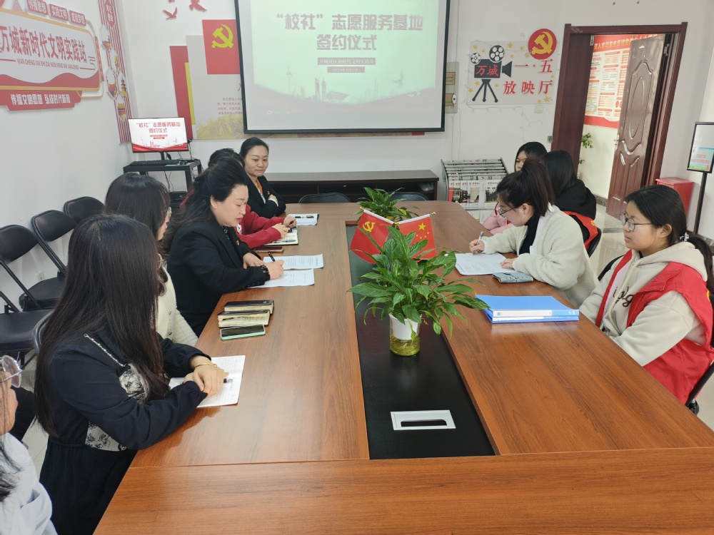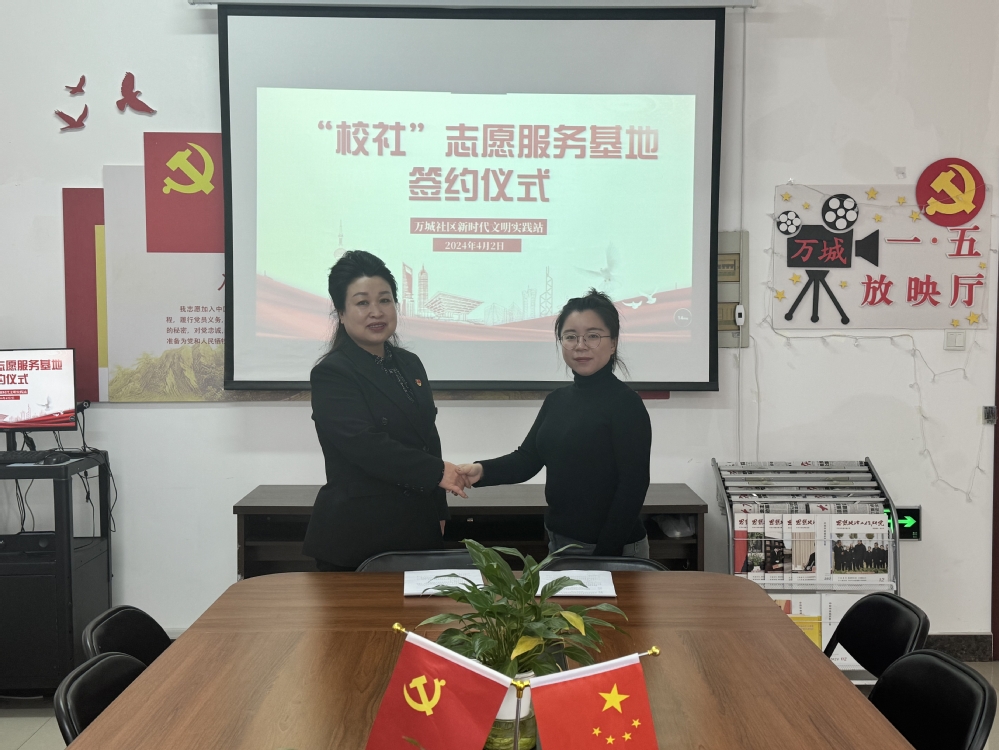 为构建校社共建的良好教育格局,促进校社资源共享、优势互补,4月2日,金沙集团1862cc成色与黎明街道万城社区签订志愿服务基地共驻共建协议,万城社区党总支书记王世君及社区工作人员、金沙集团1862cc成色青年志愿者协会指导教师金馨悦及学生志愿者代表参加签约仪式。