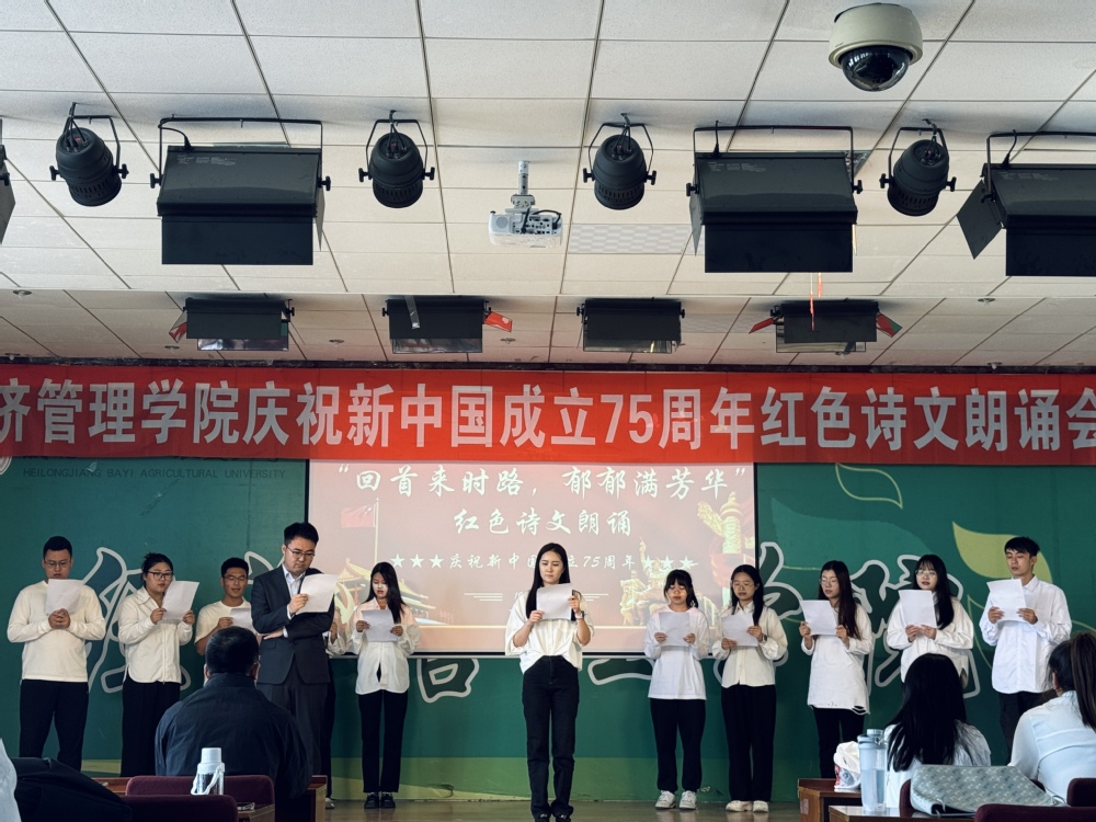 9月29日,学院在经管楼445报告厅举办红色诗文朗诵活动,2024级研究生以班级为单位倾情朗诵《华夏颂歌七十五载》《盛世中华,荣耀七十五载》等爱国主题诗歌,声音铿锵有力、句句动人,充分展现了青年学生的赤子之心和对祖国的无限热爱,活动现场高潮迭起、气氛热烈。