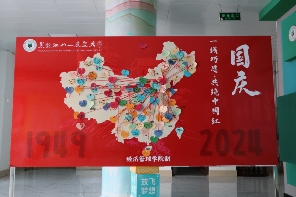 学院在经管楼大厅设置了用KT板制作的中国地图,经管学子在卡片上写下对祖国的美好祝福,利用细钉和红丝线将家乡与北京相连,“牵丝”地图成为国庆节期间学院最热门的网红打卡点。
