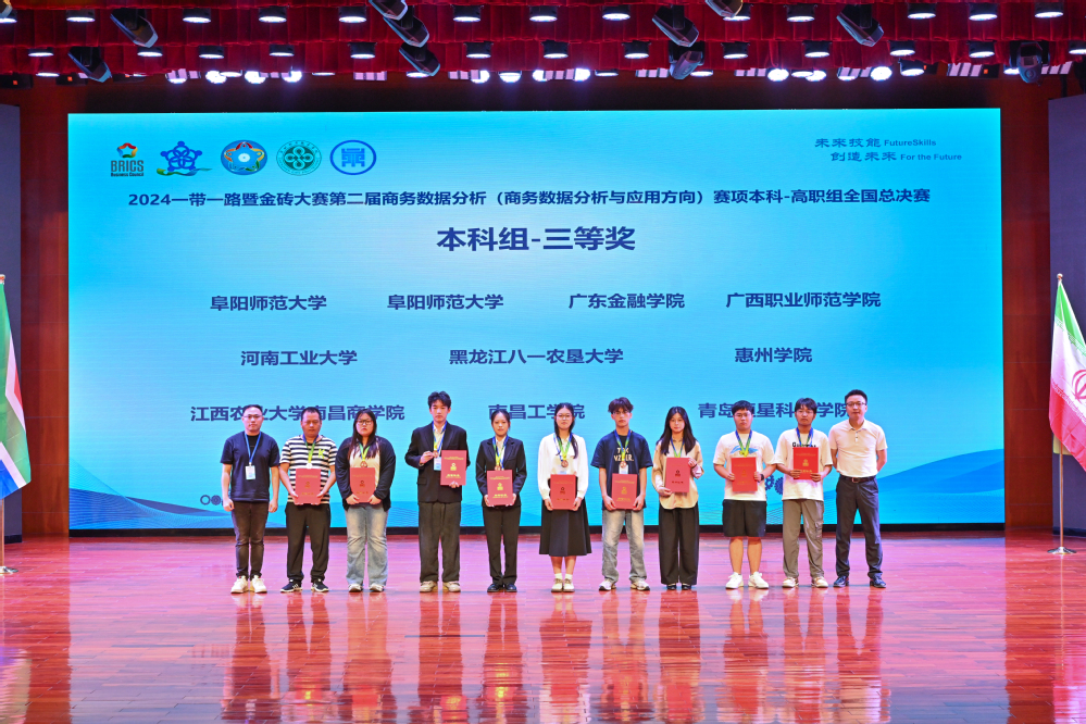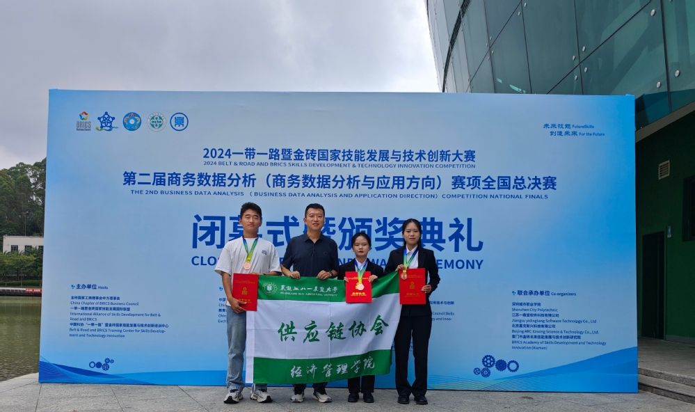 10月18日至20日,2024一带一路暨金砖国家技能发展与技术创新大赛之第二届商务数据分析(商务数据分析与应用方向)赛项全国总决赛在深圳城市职业学院举行。金沙集团1862cc成色供应链管理专业学生陈奕君、林婵、魏显霁组成的黑龙江八一农垦大学第3队,在指导老师刘永悦的悉心指导下,认真研究比赛规则,做了充分的准备,经过选拔赛、商务数据分析与汇报PPT制作、全国总决赛线下赛汇报答辩多轮激烈竞争,最终获得全国总决赛三等奖。刘婷、吴亚男、钱坤组成的黑龙江八一农垦大学第1队获得选拔赛二等奖,杨滨、刘欢、王珂组成的黑龙江八一农垦大学第2队获得选拔赛优秀奖。