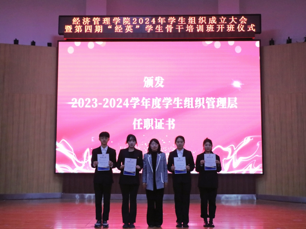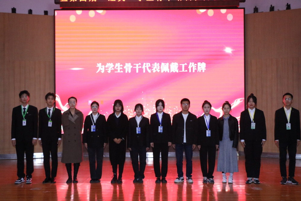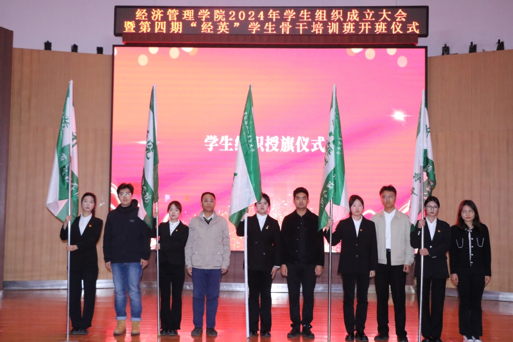 会议在庄严的国歌声中拉开序幕。会上宣读2024-2025学年学生组织骨干任职决定和第四期“经英”学生骨干培训班班委及学员名单,学院辅导员为学生组织授旗,为上一届学生组织管理层颁发任职证书,并为新一届学生骨干代表佩戴工作牌。