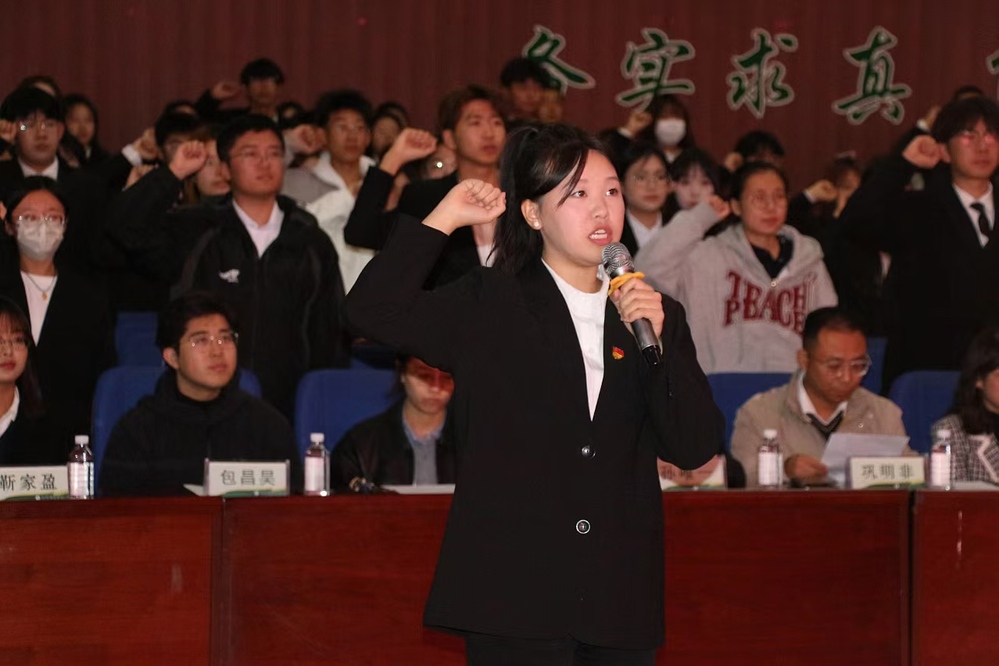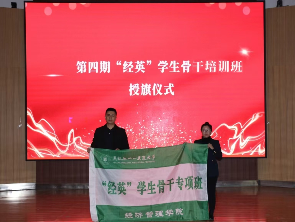 张春磊为第四期“经英”班班主任金馨悦授旗。学院第七届第二课堂服务中心主任崔迪带领全体学生骨干进行宣誓。第四十六届学生会执行主席季可心作为第三期“经英”班学员代表发言,分享参与第三期培训的体会收获,并倡议全体学生骨干恪守学生本分,牢记服务宗旨,让责任、奉献和自律常驻心间,发挥好示范引领作用。