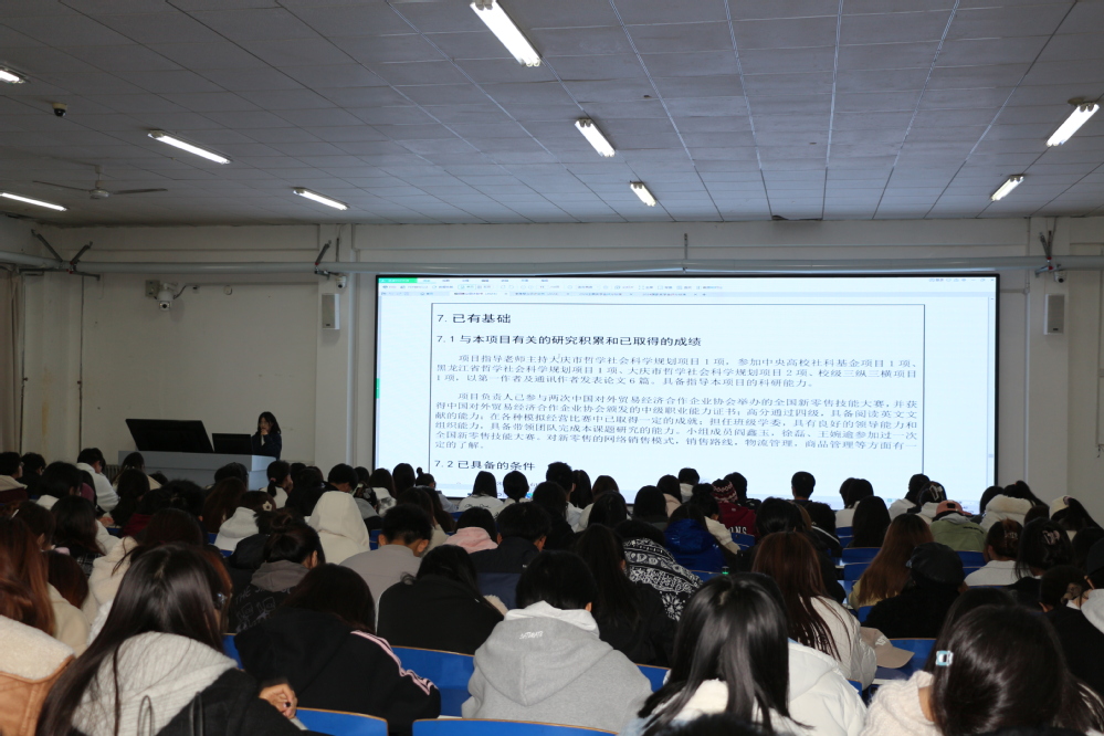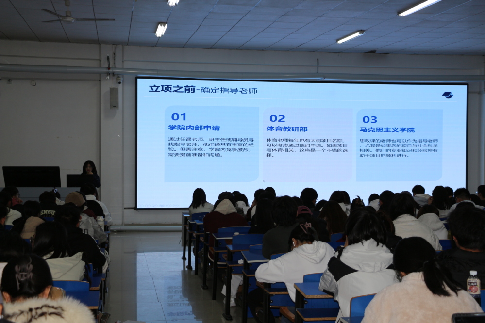 2021级学生熊招娣作为分享人,讲述了自己丰富的参赛经历和立项过程,从大创项目申请与维护、课题参与策略、竞赛参与指南三个方面分享经验,就选题及指导教师确定、团队组建、大创项目申报书撰写以及结题验收答辩准备等方面向同学们分享了她的见解和建议。