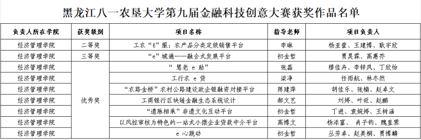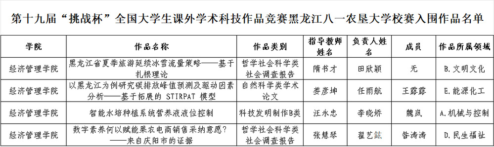 在第十九届“挑战杯”全国大学生课外学术科技作品竞赛黑龙江八一农垦大学校赛中,我院选送的4件作品成功入围,作品覆盖哲学社会科学类、自然科学类、科技发明制作类领域,充分体现经管学子立足专业、关注国家和社会现实热点的创新视野。