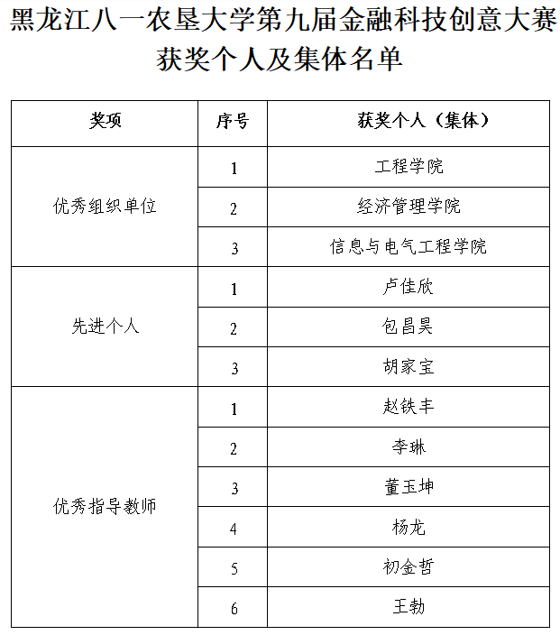 在校第九届金融科技创意大赛中,学生团队荣获二等奖1项、三等奖1项、优秀奖7项,获奖项目总数占赛事全部奖项的60%;学院荣获“优秀组织单位”称号,包昌昊获评“先进个人”荣誉称号,李琳获评“优秀指导教师”荣誉称号。