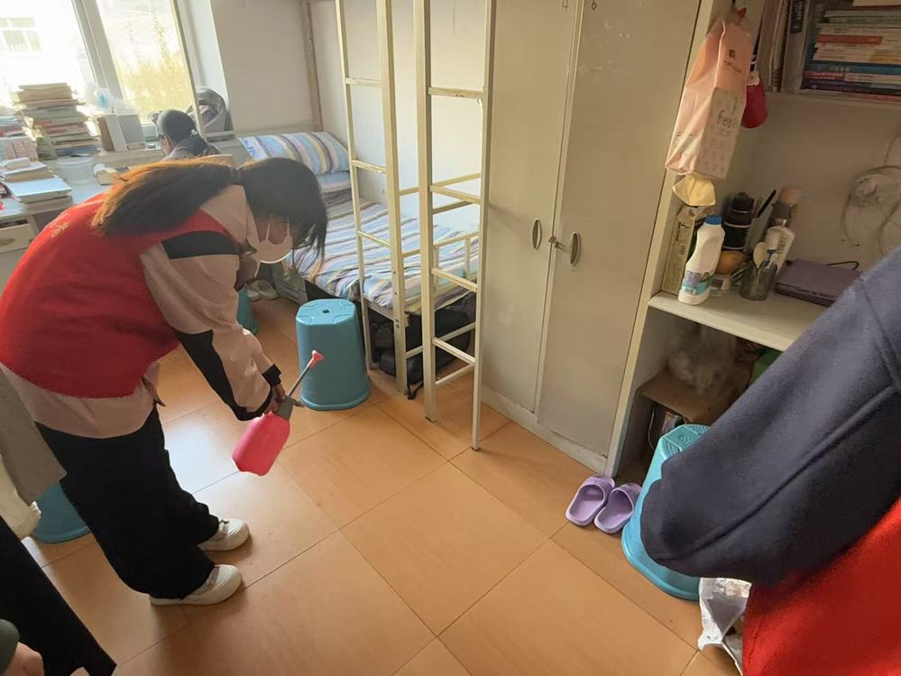 活动中,学生骨干身着红色马甲,手持消毒喷壶,严格按照卫生消杀标准规范操作,对寝室门把手、桌面、床架、卫生间等高频接触的部位进行重点消杀,同时协助整理寝室杂物、开窗通风。
