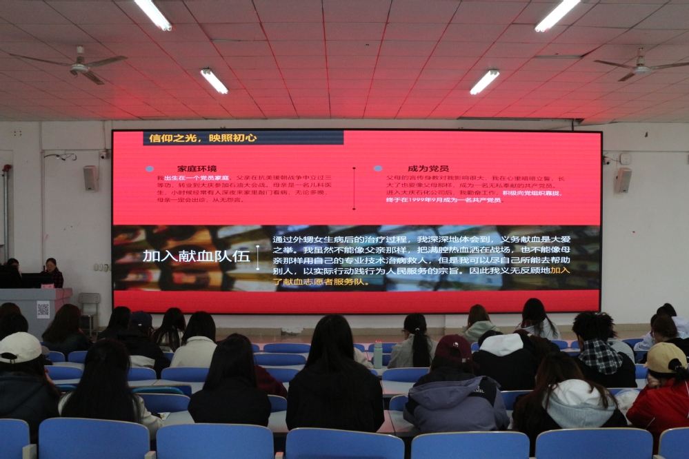 “献血会影响健康吗?”“如何克服第一次献血的紧张?”面对同学们的踊跃提问,刘敏结合亲身经历一一解答,现场气氛热烈活跃。“青春因奉献而闪耀,人生因担当而厚重”,刘敏在总结中鼓励在场师生,从力所能及的点滴小事做起,将“小我”融入“大我”,用志愿服务书写青春担当,用热血奉献传递时代温度。