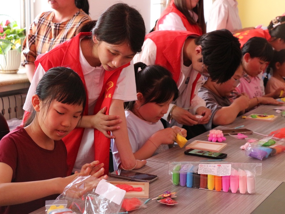 “童心向阳”环节中,“水花奇遇记”项目通过吹运乒乓球锻炼小朋友们的专注力与协调能力,“彩泥梦工厂”项目中,志愿者引导小朋友们用彩泥创作表达情绪,如“红色代表勇气,蓝色代表平静”,引导小朋友们在手工实践中学会情绪管理。活动尾声,孩子们手持作品与志愿者合影,稚嫩的脸庞洋溢着收获的喜悦。