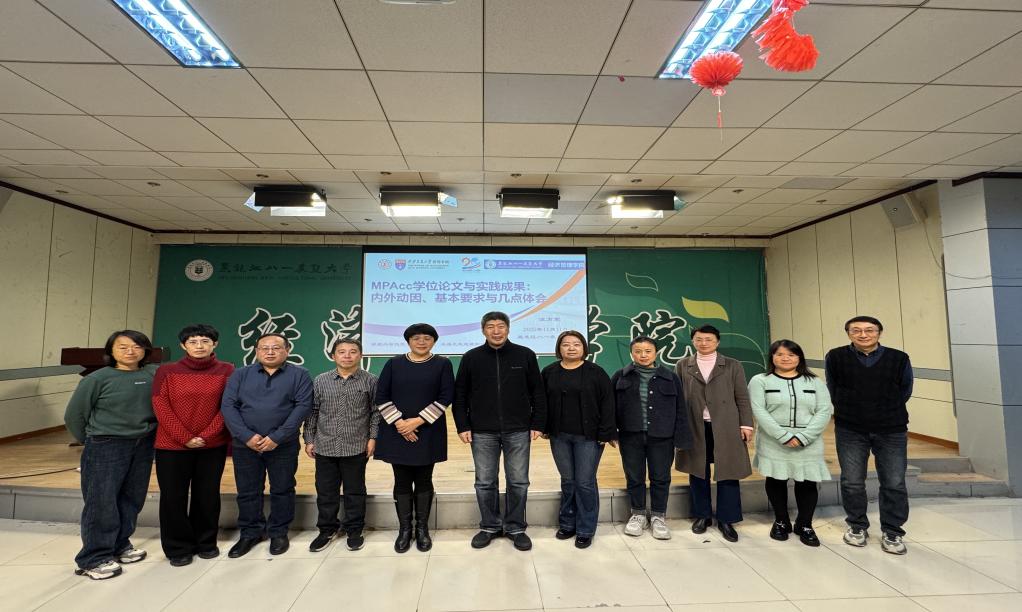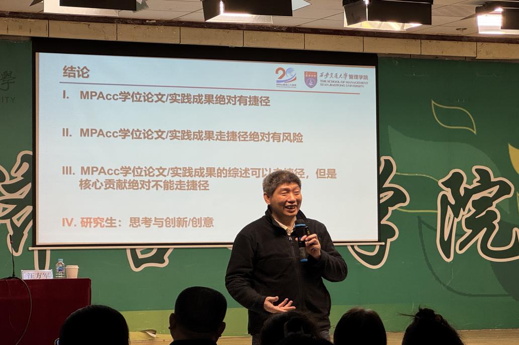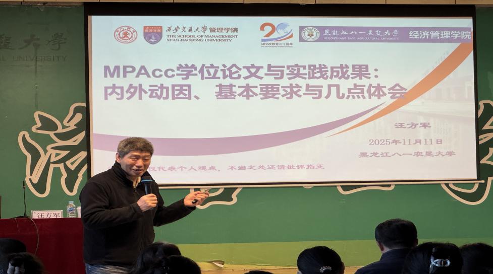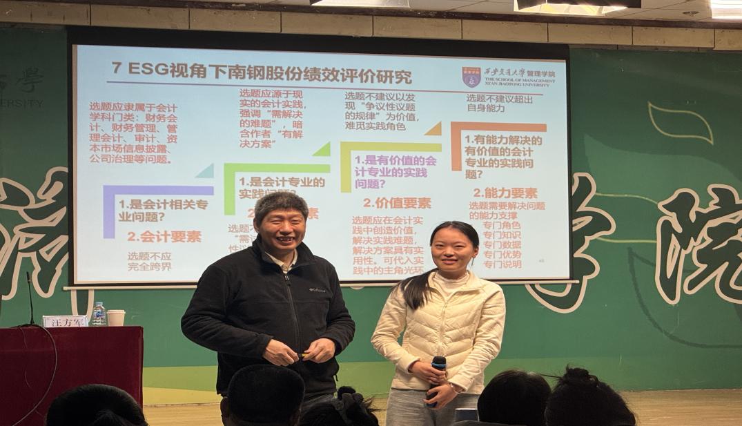 11月11日下午,一场聚焦会计硕士学术能力提升的专题讲座在经管楼445报告厅举行。本次讲座特邀中国会计学界知名专家、教育部会计专业学位研究生教育指导委员会委员、西安交通大学汪方军教授主讲,主题为“会计硕士学位论文与实践成果基本要求”。金沙集团1862cc成色院长徐素波、副院长耿晓媛、东北石油大学部分教师代表以及学院百余名师生共同到场聆听,现场学术氛围浓厚。
